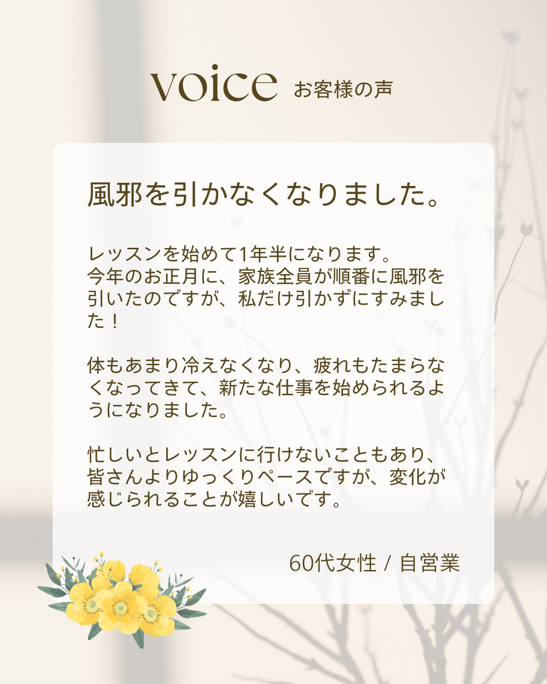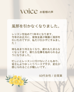 2026年1月15日 / 最終更新日時 : 2026年1月15日 ibyoga.yagoto@gmail.com エクササイズ 【体験談】風邪を引かなくなりました! こんにちは!イルチブレインヨガ八事スタジオです。 嬉しいお言葉をいただきました🎵 寒さに負けない体づくりを、一緒に楽しくしませんか? スタジオでお待ちしています💕 この記事が気に入ったらいいね!&フォローしよう @ilchibrainyoga FacebookXBlueskyHatenaCopy